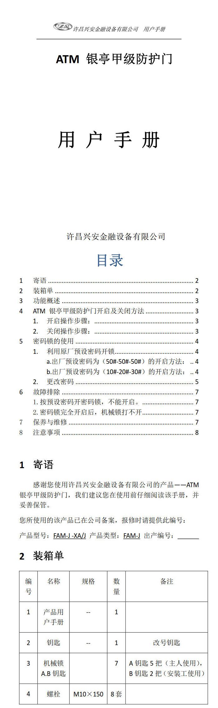 ATM銀亭甲級(jí)防護(hù)門(mén)用戶手冊(cè)