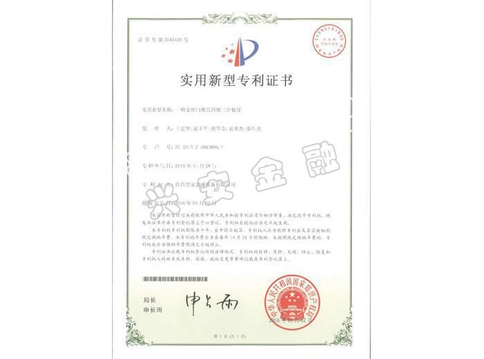 金庫(kù)門(mén)鎖具三鎖兩開(kāi)裝置專(zhuān)利證書(shū)